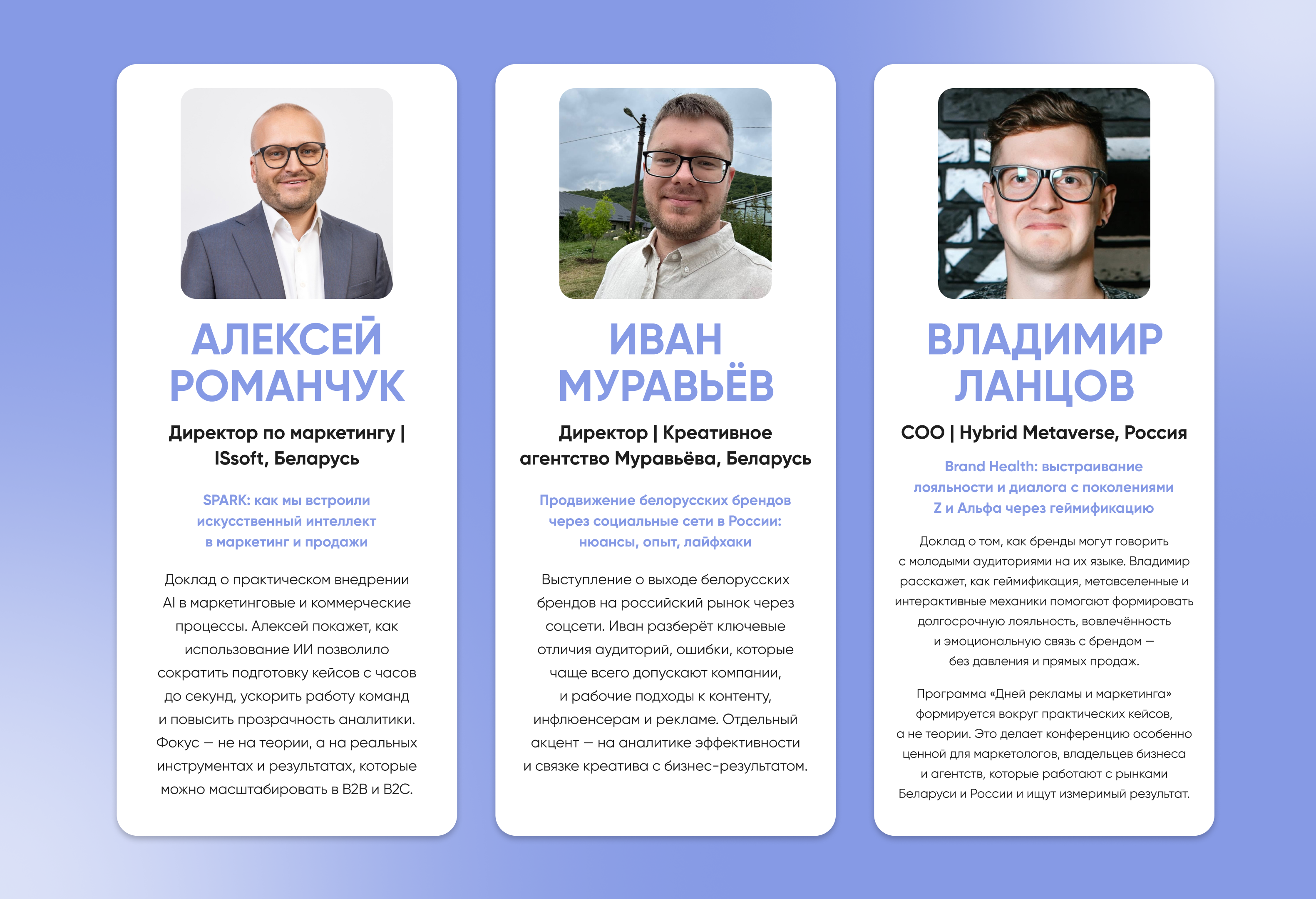 Ответ прост: чтобы экономить месяцы на поиске решений. «Дни рекламы и маркетинга» – это концентрат опыта и инсайтов, который поможет избежать ошибок и ускорить рост. Вместо десятков экспериментов вы получаете проверенные методики и сразу видите, что работает на рынке Беларуси и России. Каждый участник найдёт полезную тему для себя, будь то таргетинг, управление брендом или работа с искусственным интеллектом.