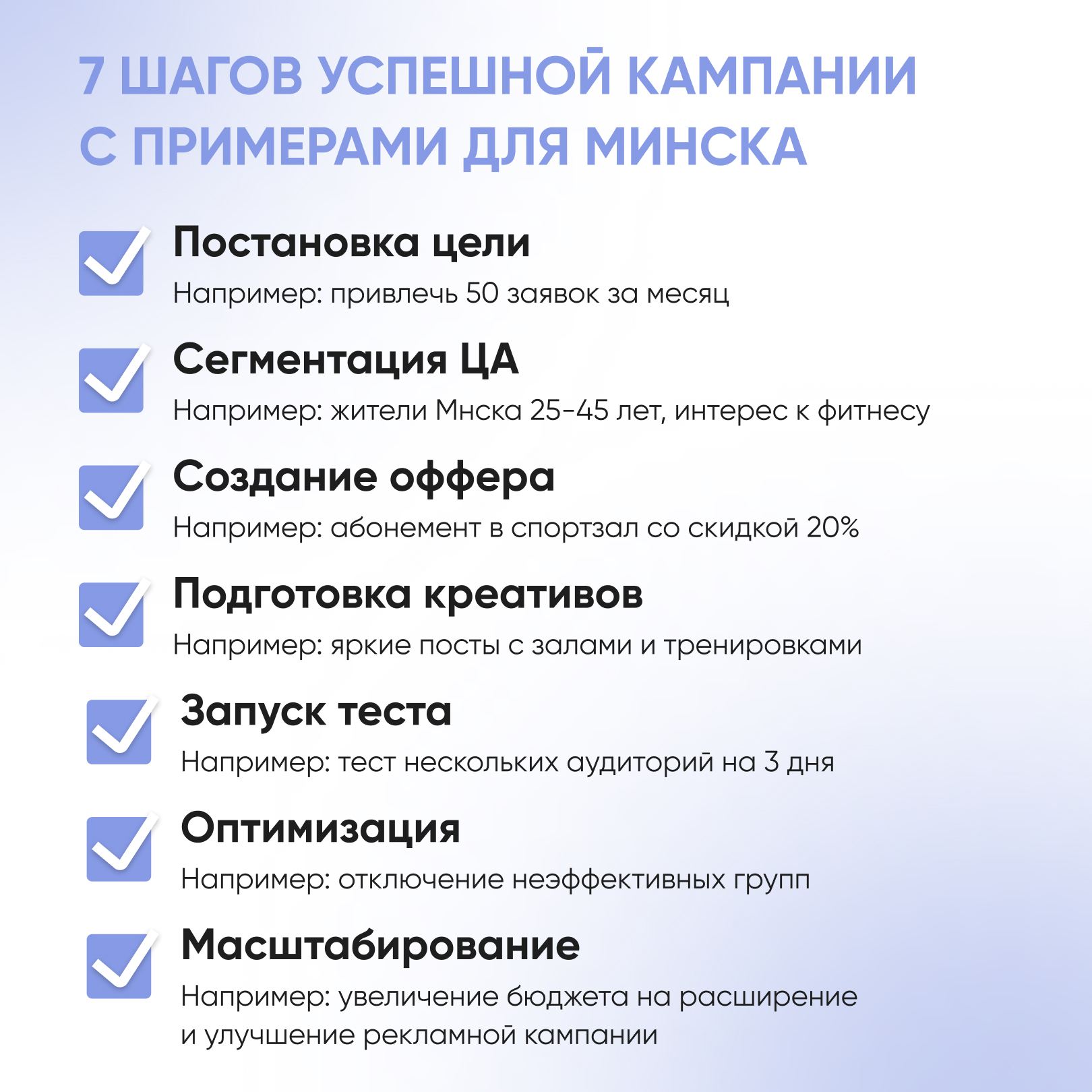 Эффективная настройка и ведение таргетированной рекламы в Минске и Беларуси всегда начинается с четкой постановки целей. Если вы не определили, чего хотите добиться — привлечь новых клиентов, повысить узнаваемость бренда или увеличить продажи конкретного продукта, — рискуете потратить бюджет без ощутимого результата.