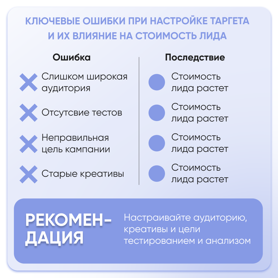 Если видите, что одна аудитория приносит лиды по выгодной цене, можно увеличить на неё бюджет. Если креатив «выгорел» (CTR упал), меняйте изображение, текст или оффер. - Работайте с тестами постоянно