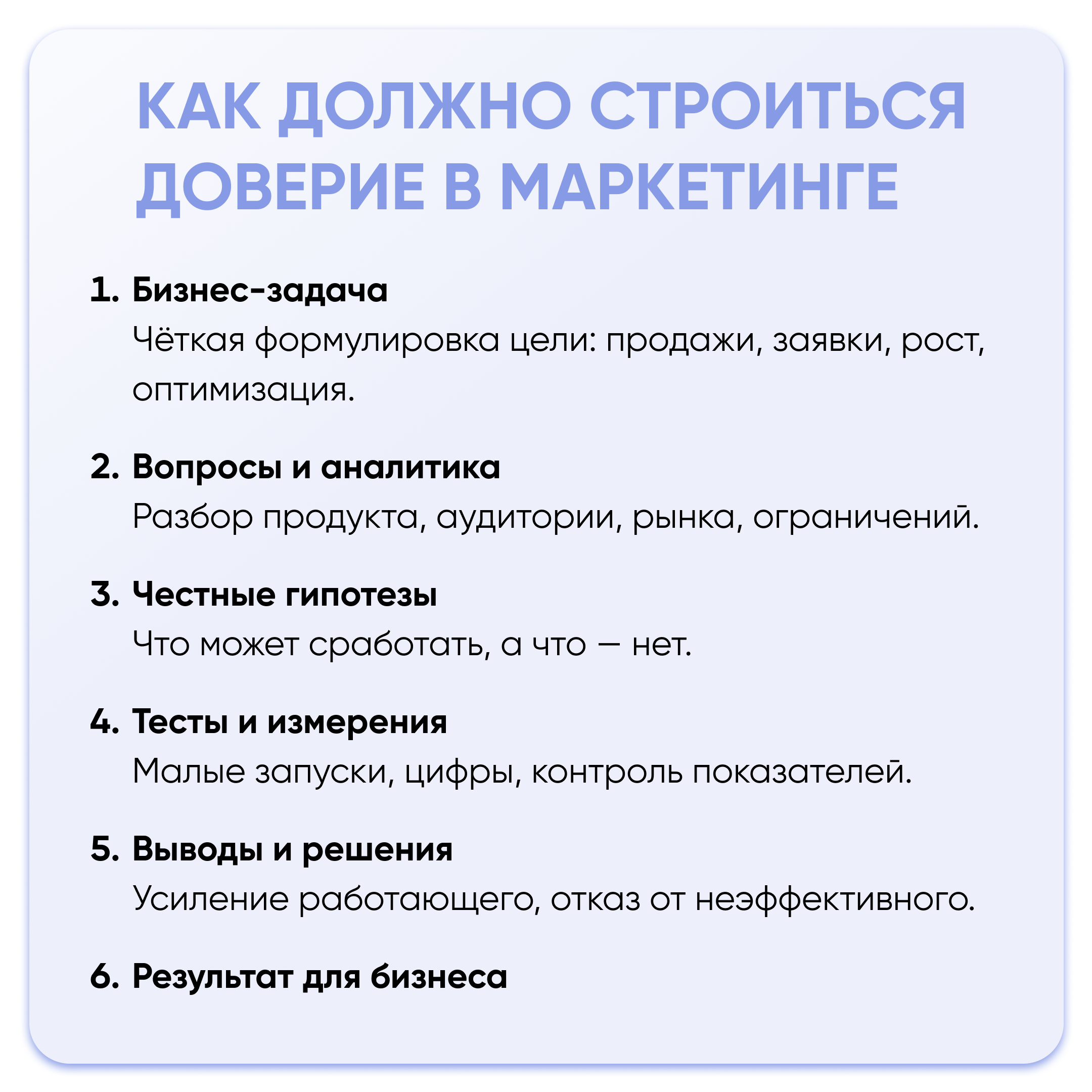 - Третье — я не обещаю результат там, где его невозможно контролировать. Маркетинг не существует в вакууме. Если внутри проекта нет обработки заявок, продукта, логики продаж — реклама не спасет ситуацию.