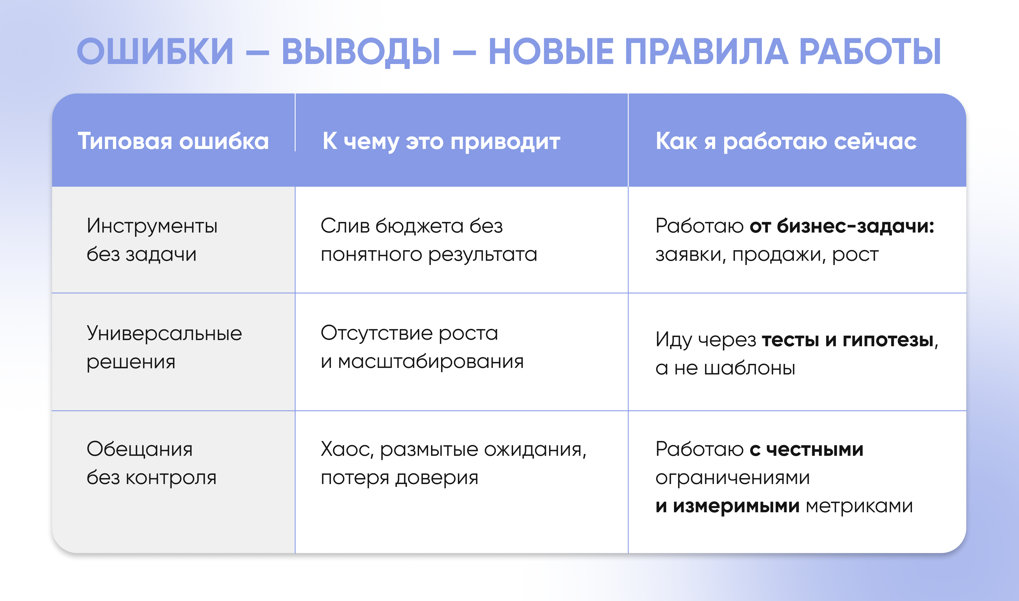 Ошибки были неизбежны. Где-то ставка делалась на охваты вместо воронки. Где-то — на активность вместо стратегии. Где-то решения принимались слишком быстро, без проверки гипотез. Эти ошибки не были «провалами» — они стали точками роста. С каждым проектом появлялось больше понимания, что именно влияет на результат.