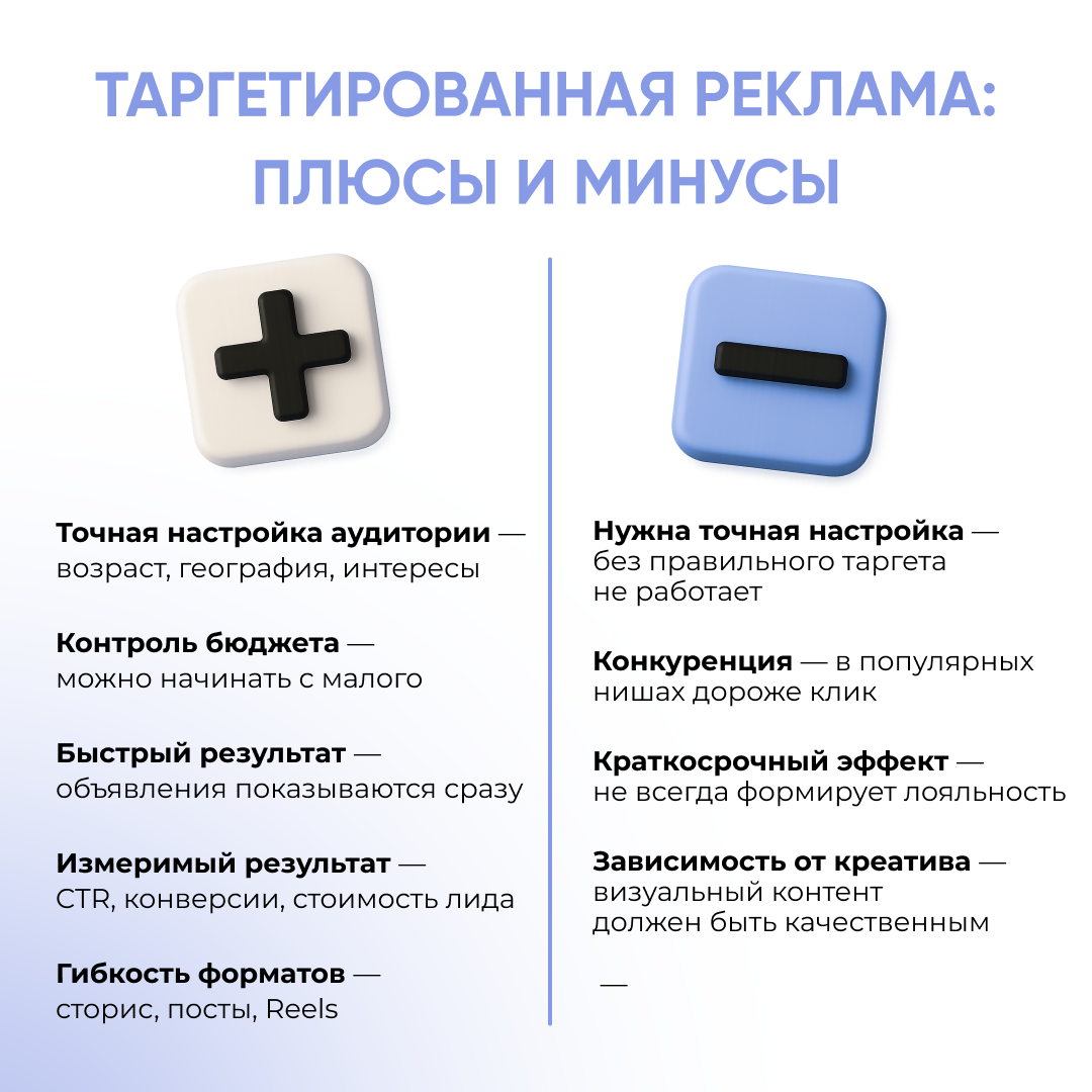 Таргет — эффективный инструмент для быстрого привлечения целевой аудитории и получения измеримых результатов. Но для успеха нужно сочетать точный таргетинг с качественным визуальным контентом и регулярной аналитикой.