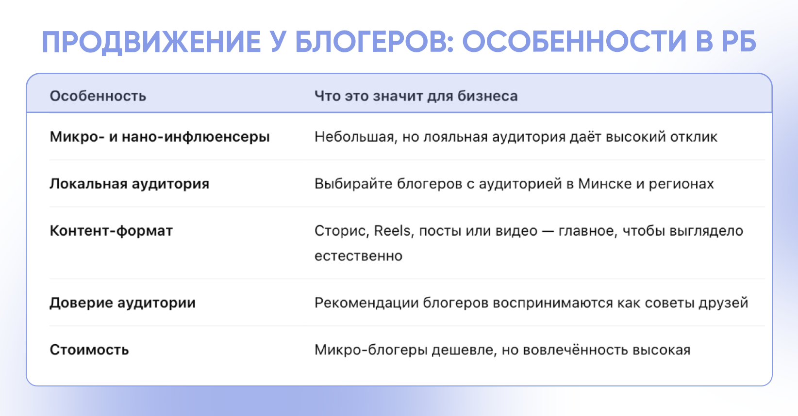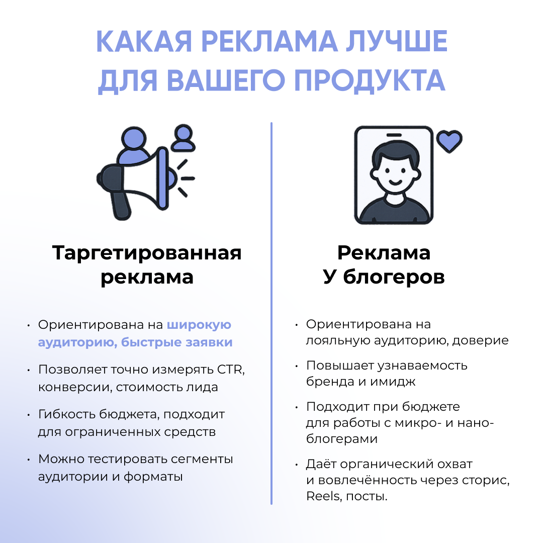 Не ограничивайтесь одним каналом. Комбинация таргета и блогеров позволяет увеличить охват и доверие к бренду, особенно для малых и средних бизнесов в Беларуси.