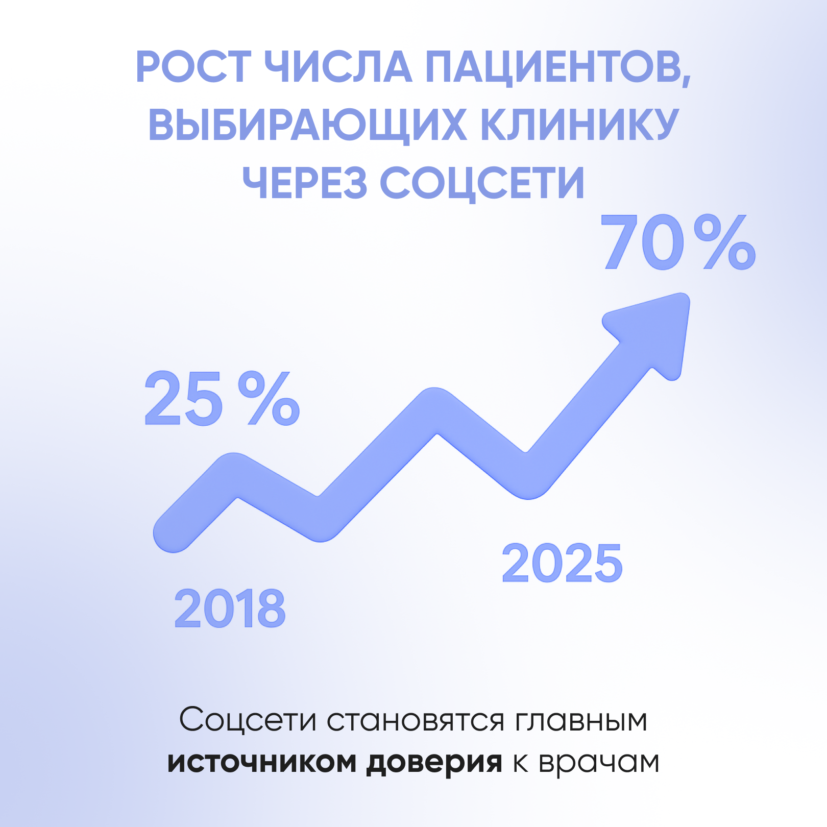 Раньше компании полагались на сарафанное радио, наружку и контекстную рекламу. Сегодня пациенты выбирают клинику не по вывеске, а по тому, что они видят в соцсетях. Сколько доверия вызывает врач, насколько современно выглядит страница, есть ли реальные отзывы. Всё это — часть СММ, где на первый план выходит не реклама, а доверие.