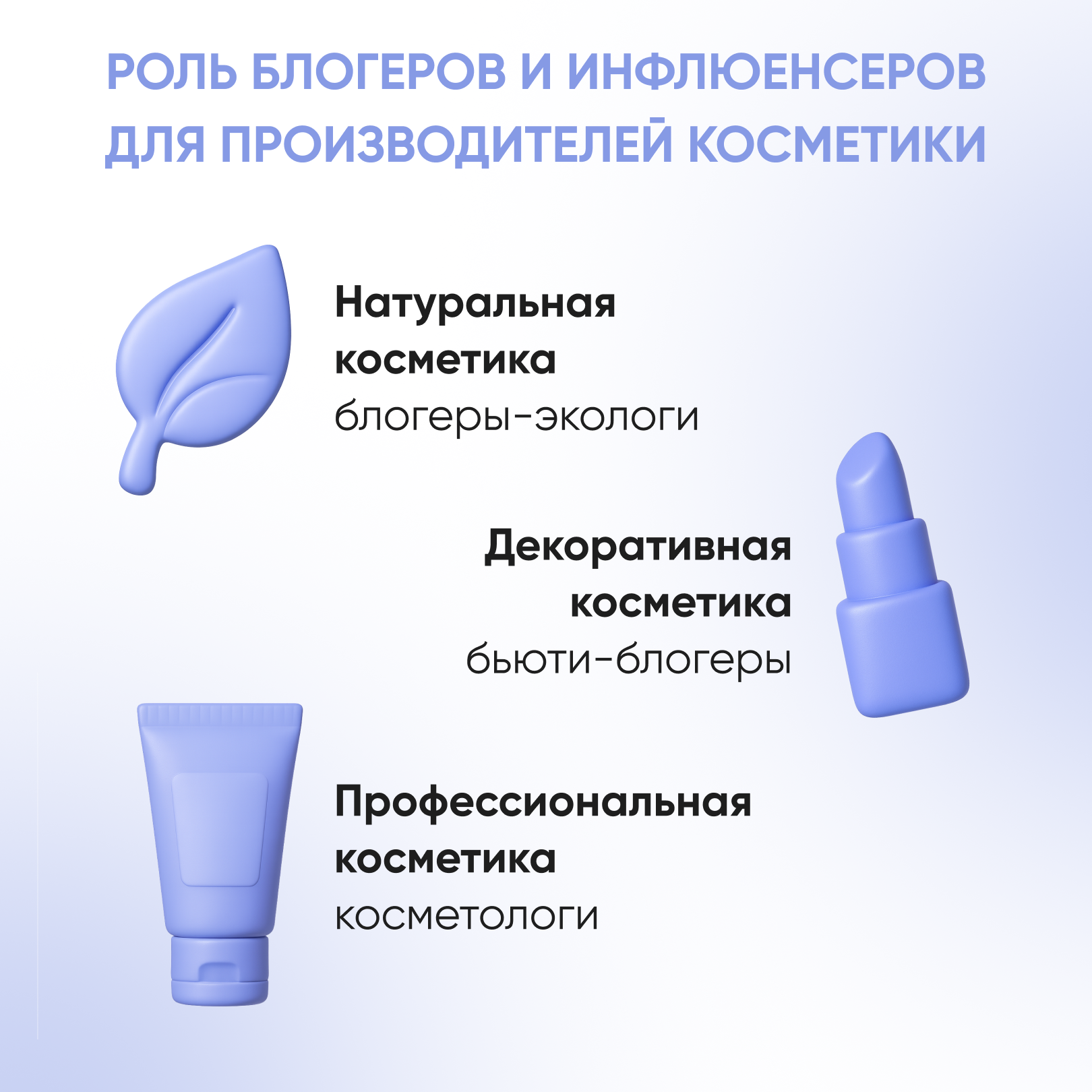 - Декоративная косметика — визажисты и бьюти-блогеры играют ключевую роль для брендов, ориентированных на макияж и стиль. Они тестируют продукцию и демонстрируют её в реальных условиях, что способствует росту доверия и интереса.