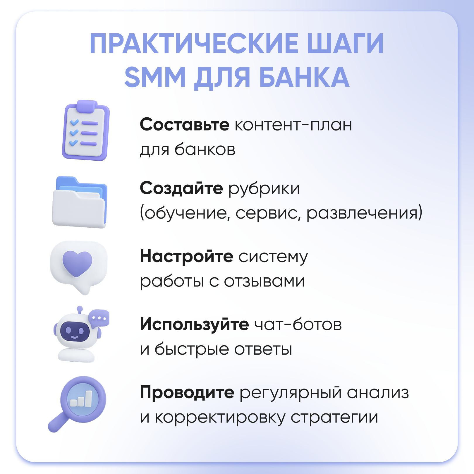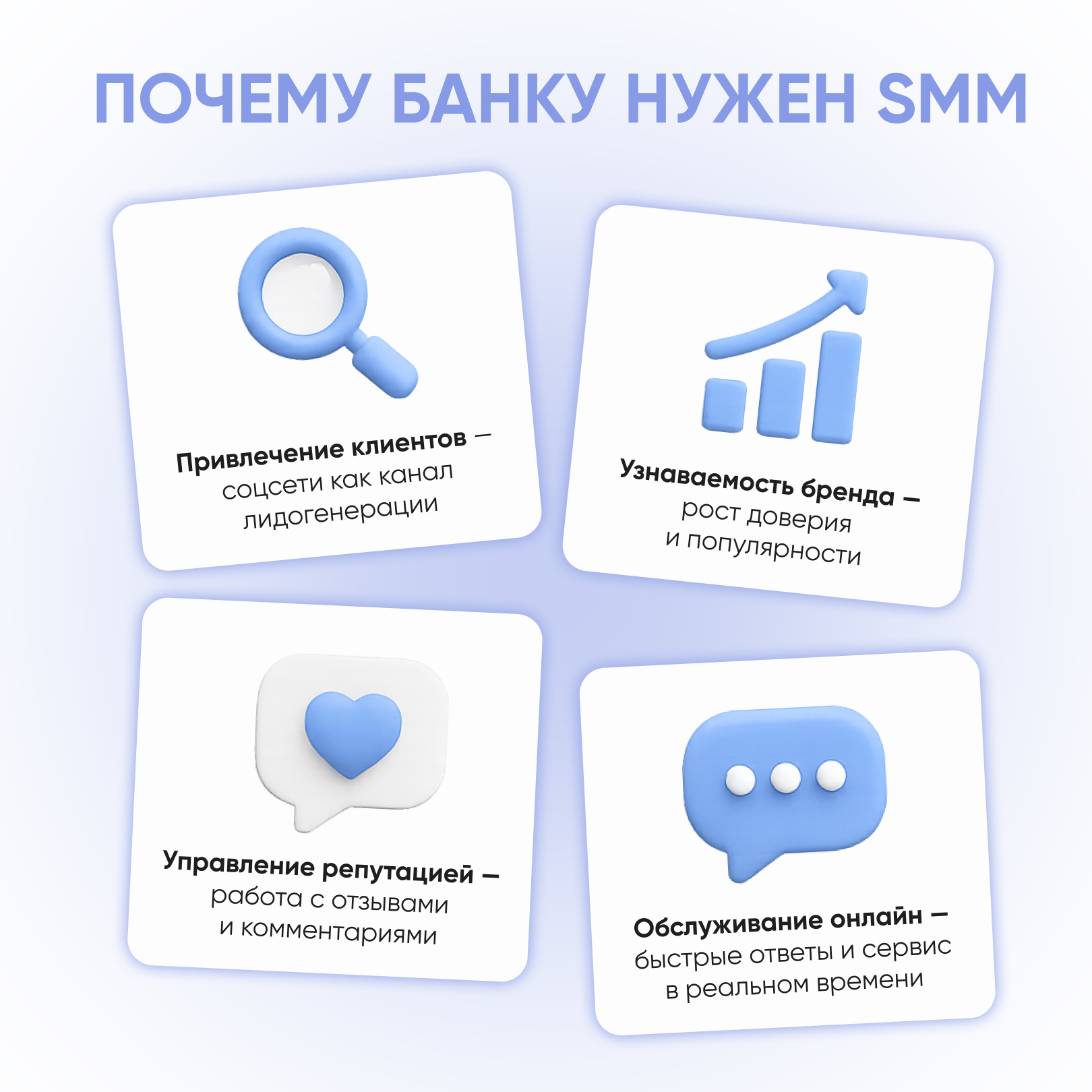 SMM для банка — это не просто модное направление, а реальный инструмент для роста бизнеса. Грамотно выстроенная digital-стратегия помогает решать сразу несколько задач: привлекать аудиторию, укреплять доверие, развивать имидж и управлять репутацией.
