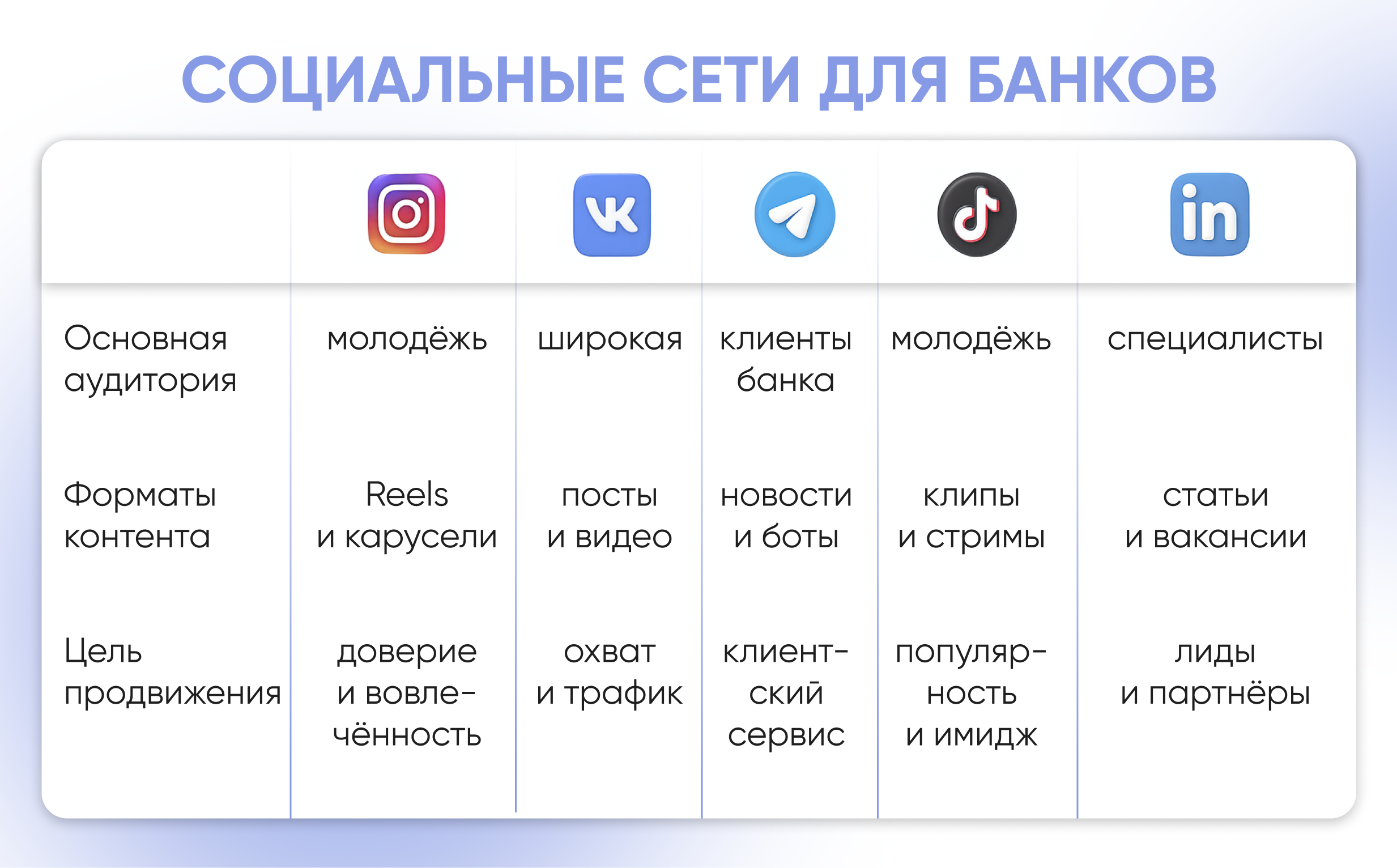 Онлайн-маркетинг решает сразу несколько задач: от повышения узнаваемости до построения репутации и обслуживания в реальном времени. В отличие от классической рекламы, стратегия работы с соцсетями позволяет точечно взаимодействовать с разными сегментами: от молодёжи, выбирающей первый дебетовый счёт, до зрелых клиентов, интересующихся ипотекой или инвестициями.