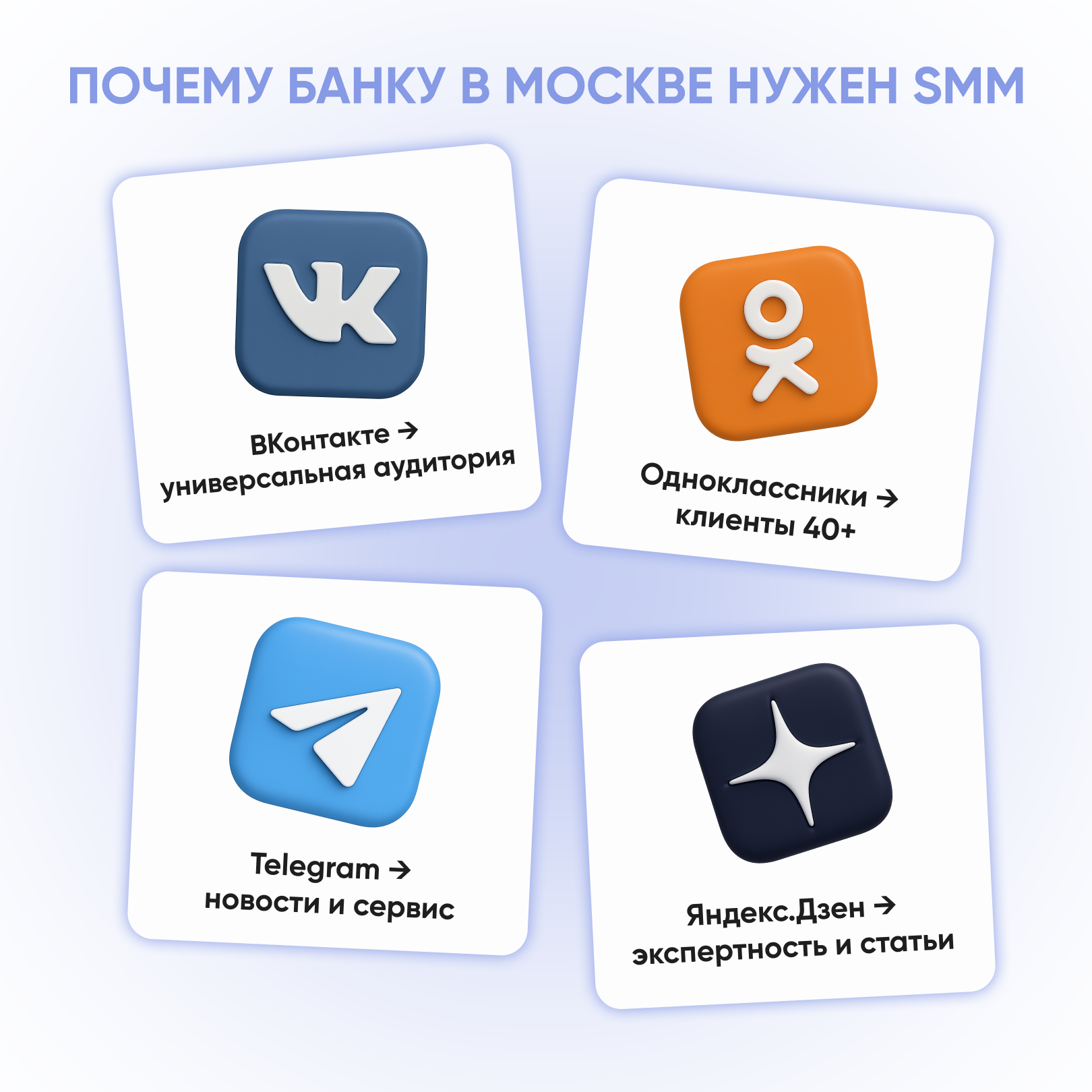 Опыт ведущих банков показывает: успех достигают те, кто активно используют локальные площадки — ВКонтакте, Одноклассники, Telegram и Яндекс.Дзен. VK становится центром для массовых рекламных кампаний, Telegram обеспечивает быстрый сервис, Одноклассники позволяют работать с возрастной аудиторией, а Дзен — укрепляет экспертность.