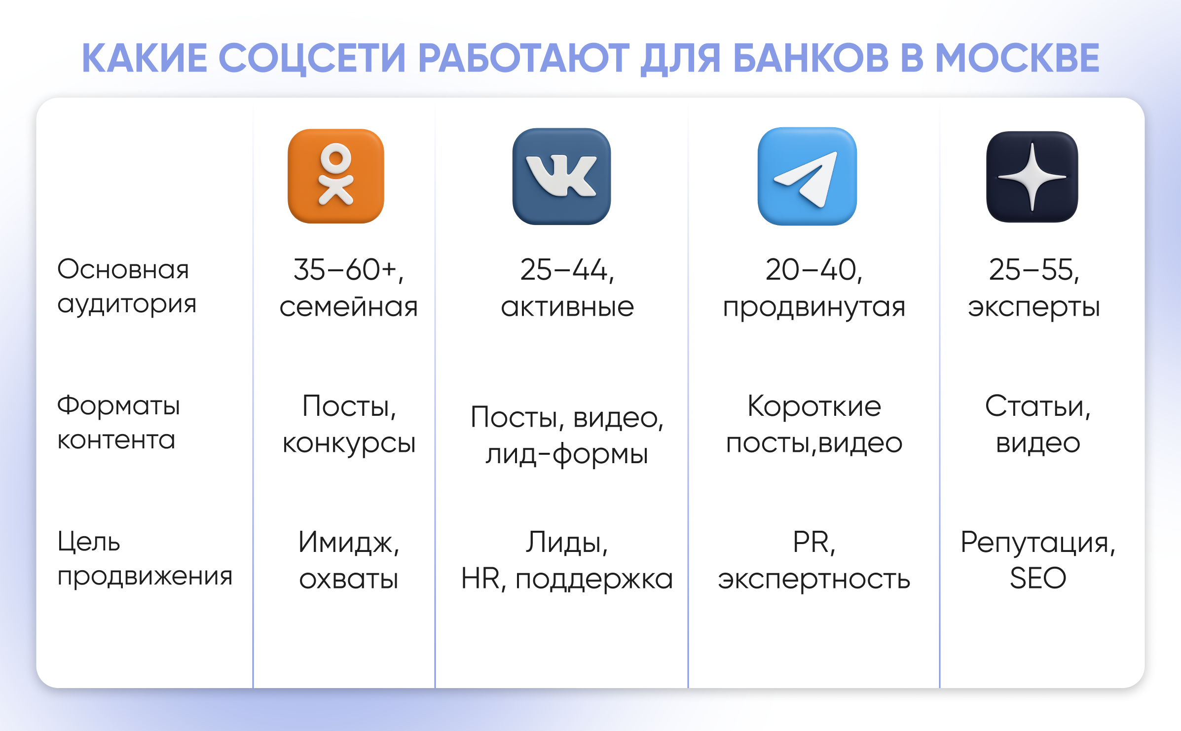 Продвижение финансовых организаций в Москве через социальные сети — это возможность работать напрямую с разными сегментами аудитории. Каждый канал выполняет свою задачу: