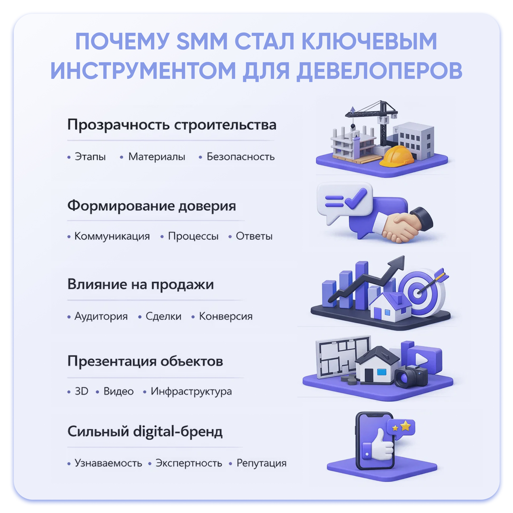 SMM для девелоперов сегодня — это не просто публикации о ходе строительства. Это полностью сформированная цифровая среда, в которой будущий покупатель знакомится с проектом, изучает преимущества, формирует доверие к компании и принимает решение о покупке. Информация переместилась в соцсети — следовательно, именно там застройщику важно объяснять ценность объекта, демонстрировать качество и выстраивать прозрачную коммуникацию.
