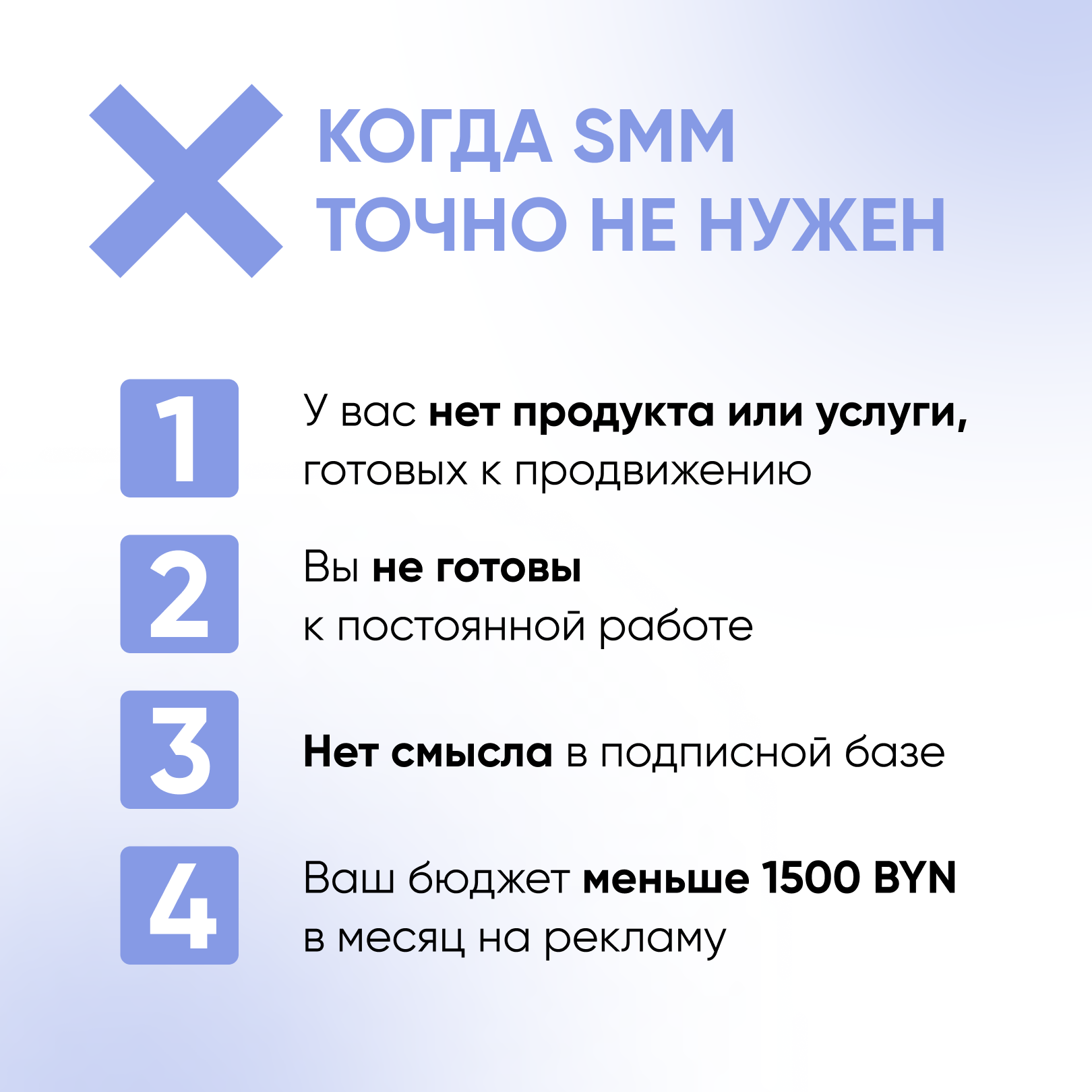 Для некоторых B2B-бизнесов из Беларуси (например, оптовой логистики или строительных тендеров) смм маркетинг не даёт прямой пользы. В таких нишах клиенты не ищут подрядчиков в Instagram. - Ваш бюджет меньше 1500 BYN в месяц на рекламу