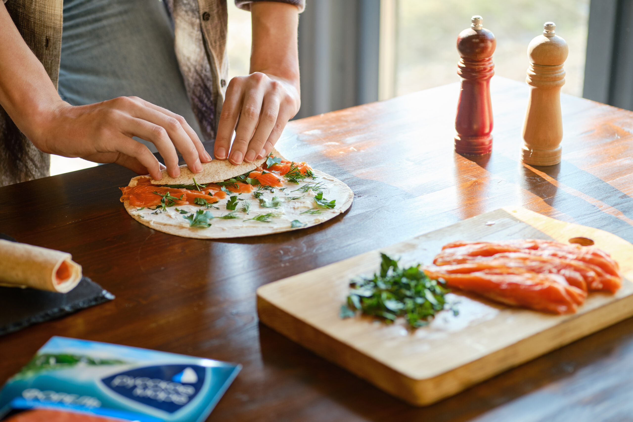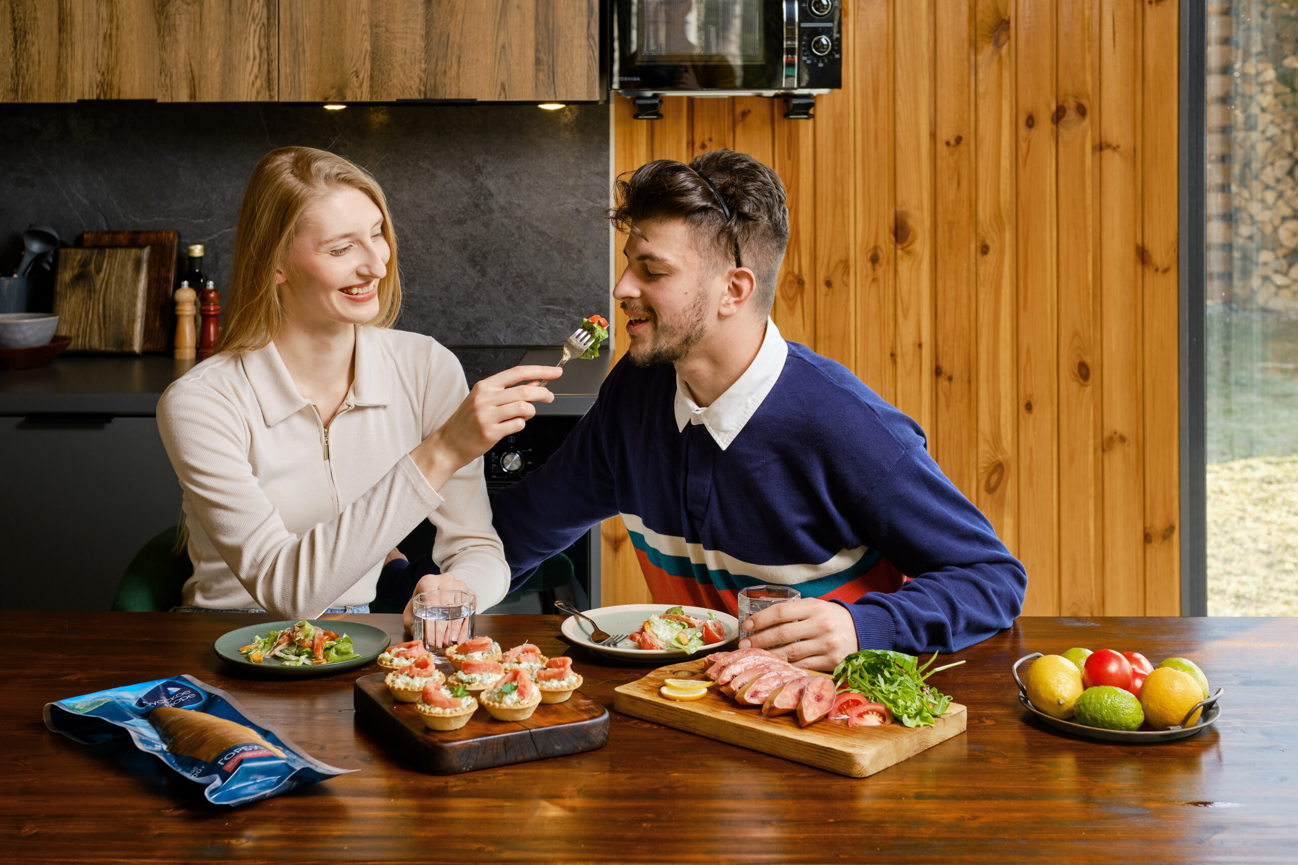 3. Локация: Для съёмок был выбран просторный минималистичный дом с большими окнами. Натуральные материалы — дерево, свет и простая мебель без лишних деталей — помогли создать лёгкую атмосферу для съемки и подчеркнуть изысканность продуктов.