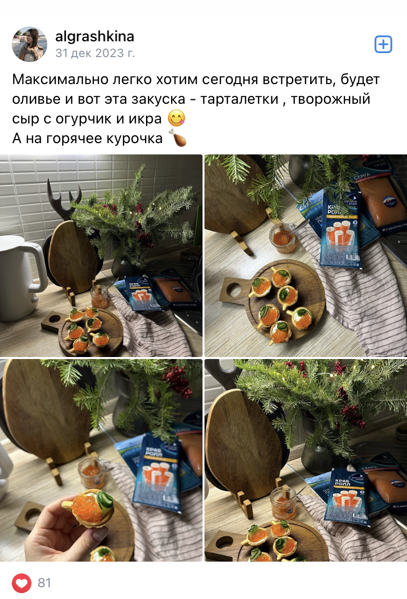 Публикации выходили в предновогодний сезон, когда аудитория активно готовится к праздникам и выбирает продукты для праздничного стола. Контент с рецептами и распаковками стал не только демонстрацией продукции, но и источником идей для пользователей, что усилило вовлечённость.
